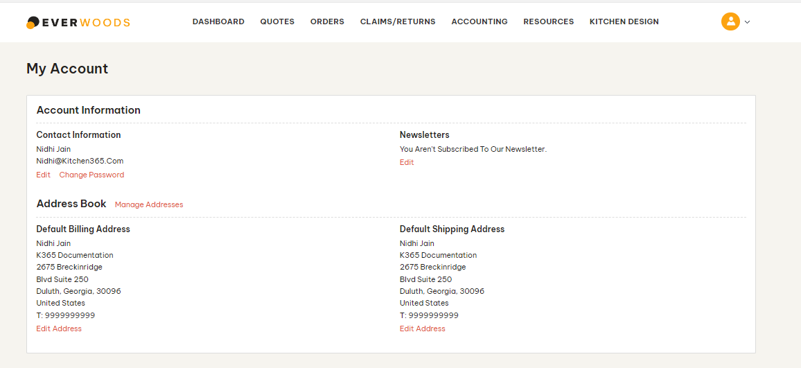 My Account Sub Menu will open a dedicated page to allow dealers to Edit their First name, Last name, Email Address, Password, Billing and Shipping Addresses and Manage More Addresses.