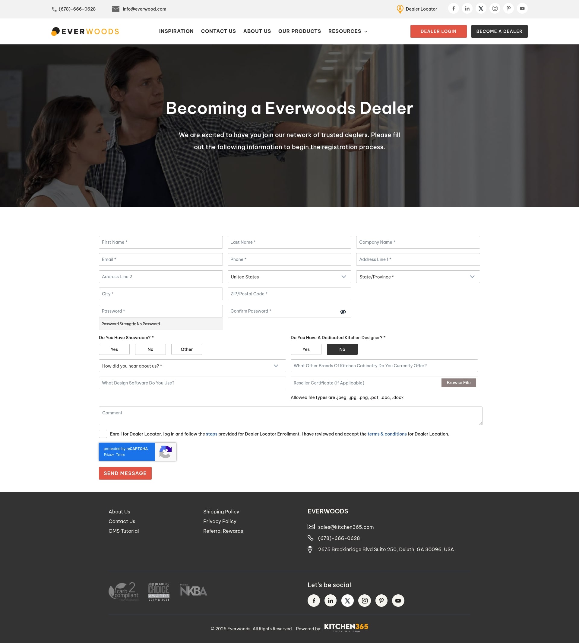 Once the end customer enters all the required details on the Dealer Registration form, it will create the company right after the form is filled. Please verify that each email address is unique and not used by another user. The system will email them about their application and initiate the Kitchen365 Client Admin to take the next action. We will, by default, keep the new dealers inactive from the backend so they can not log into the portal before approval.